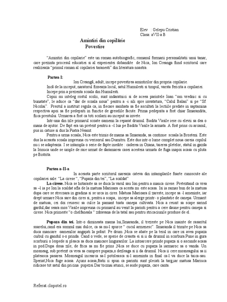 Suciu Mihai Amintiri Din Copilarie Rezumat Capitolul 1 2 3 4