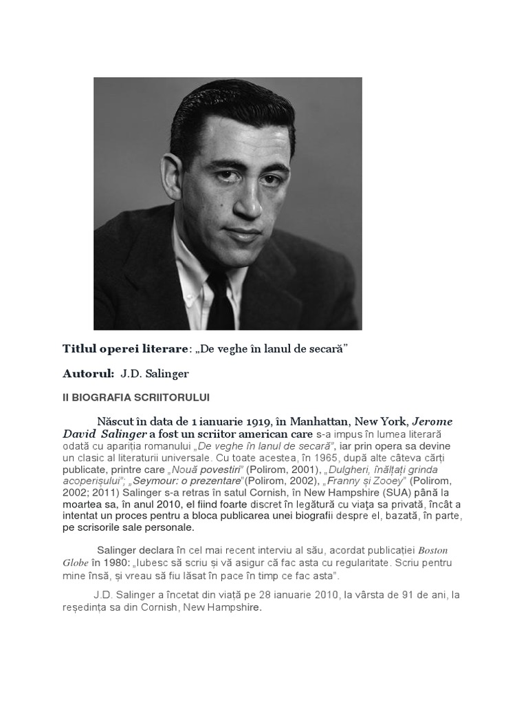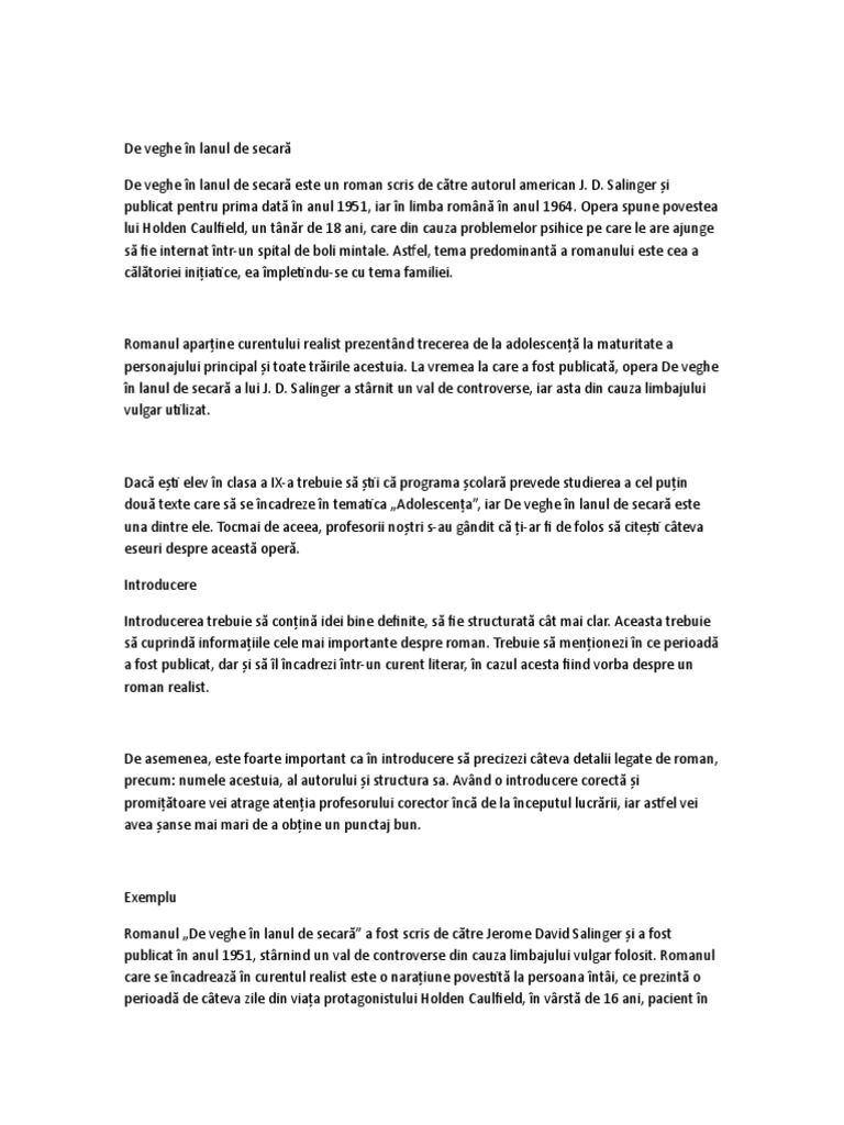 Fisa De Lectura De Veghe In Lanul De Secara
