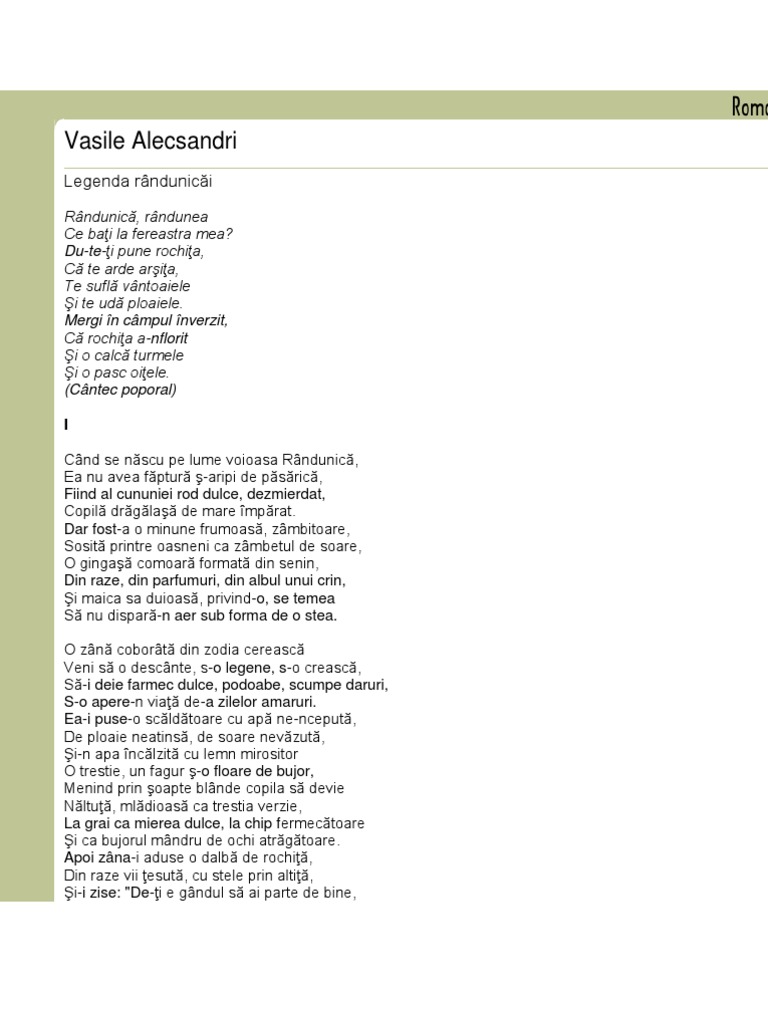 Legenda Randunicăi De Vasile Alecsandri Liber Să Spun Pagina Home
