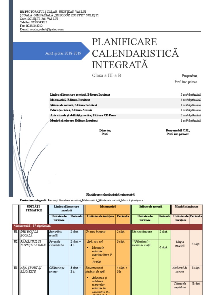 Planificare Calendaristica Integrata Clasa A Iii A 2018 2019 Mioara21 26 09 2018